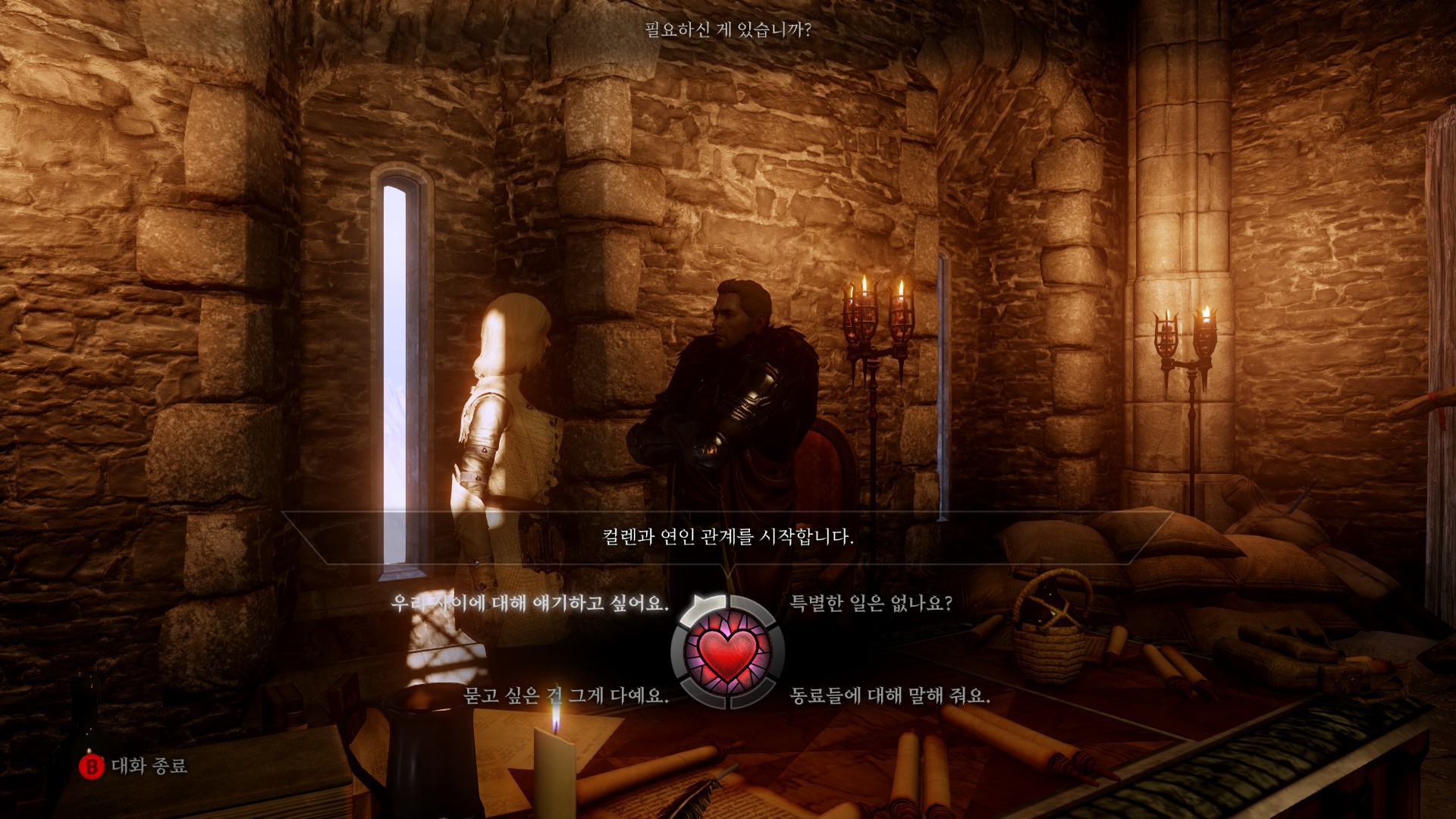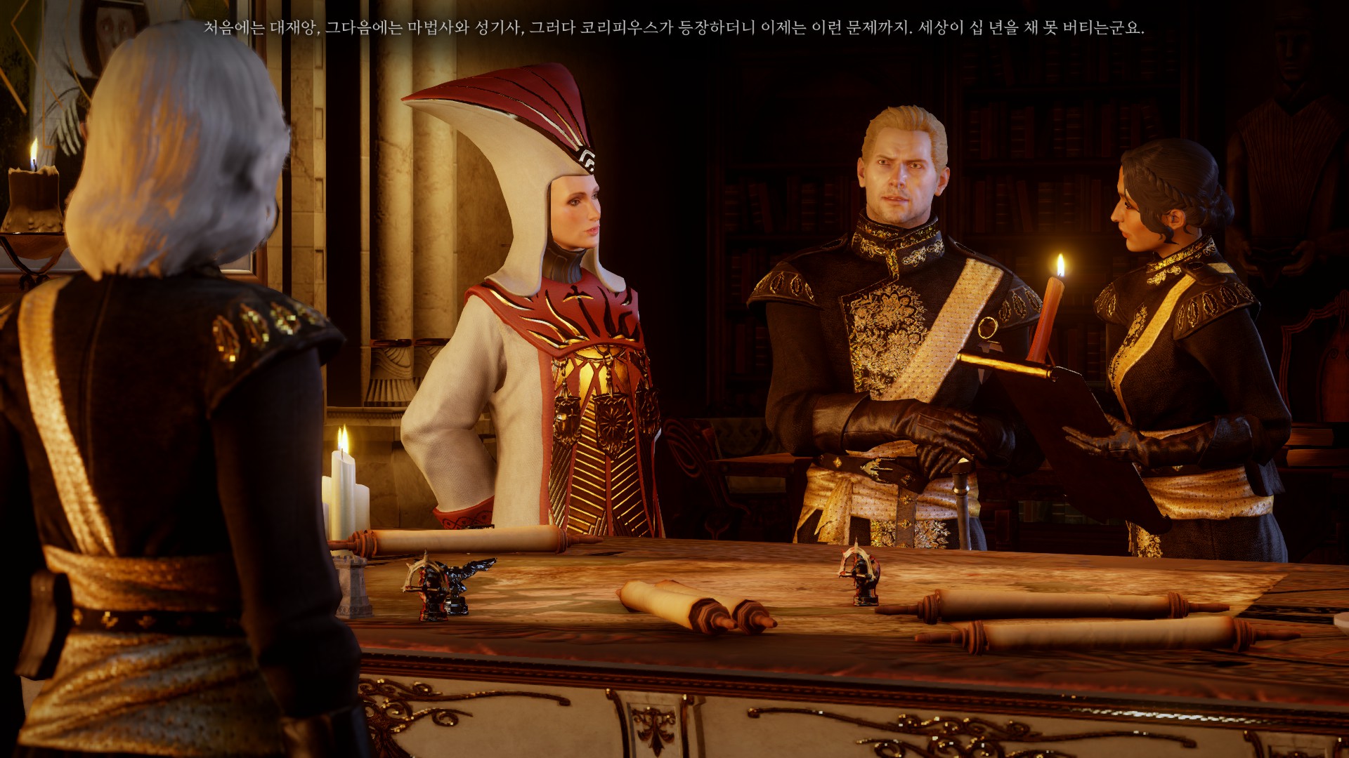 인퀴지션에서 가장 마음에 들었던 부분을 꼽자면 1초의 망설임도 없이 로맨스와 워 테이블이다. 유구한 로맨스 맛집이니 전자는 아는 맛이었지만 후자가 매우 새롭고 흥미로웠다. 워 테이블을 사용하는 내내 내가 정말 한 집단을 이끄는 지도자이자 지휘관이 된 느낌을 받았다. 정치 상황 봐서 암살, 교섭, 무력 중에 어떤 걸 고를지 고민해야하고 리얼 타임으로 돌아가니까 시간 효율도 따져야하고 연계되는 이야기도 있어서 꼼꼼하게 읽고 무엇부터 어떻게 해결해야할지 깊게 생각하게 되었다. 단 한 번의 잘못된 선택으로 부족을 멸망시키고나서야 워 테이블의 무서움을 알았어요...ㅎ퀘스트하다가 임무 끝났다는 연락받으면 호다닥 하늘보루로 돌아가서 다시 작전 짜는 것도 몰입도에 지대한 공헌을 했다. 그리고 인퀴지터 업무를 하다보니 왕하기 싫다고 찡얼거렸던 알리스터가 떠올랐다. 한 사람, 한 부족, 한 나라의 명운이 내 손에 걸렸다는 건 정말 힘든 일이구나. 온갖 진영에서 심판 하나에 무수한 좋아합니다와 싫어합니다를 함께 건네주니 어깨가 무겁다. 알리스터야 왕할 수 있다고 가볍게 말해서 미안해ㅋㅋㅋㅋㅋㅋㅋㅋ