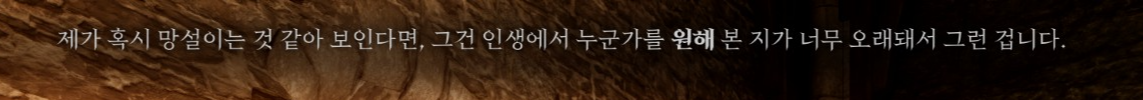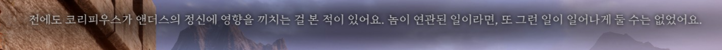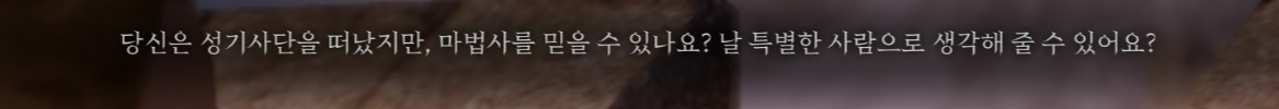 이거 하나 때문에 솔라스랑 연애할 뻔했다. 영상 찍어두지도 않았고 유툽에서 따로 찾아보지도 않았으니 2회차까지 돌면서 딱 2번 들은 대사인데 아직도 솔라스의 목소리 톤과 음에 섞여 들어간 숨, 번뜩 깨인 내 정신처럼 깜짝 놀라 일어나던 인퀴의 모습이 망령처럼 머릿속을 맴돈다. 신비로운 마법사라는 솔라스의 가장 큰 캐릭터성을 저 문장 하나가 전부 표현해냈다. 이 이벤트 이후로 대머리가 괜찮아보임ㅋㅋㅋㅋㅋㅋㅋㅋㅋㅋㅋㅋㅋㅋㅋㅋㅋㅋㅋㅋㅋㅋㅋㅋㅋㅋㅋ콩깍지는 정말 답도 없구나.