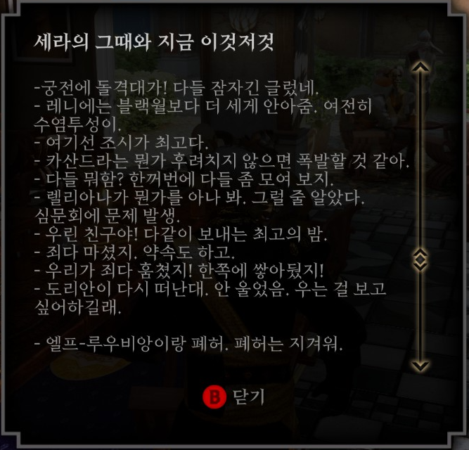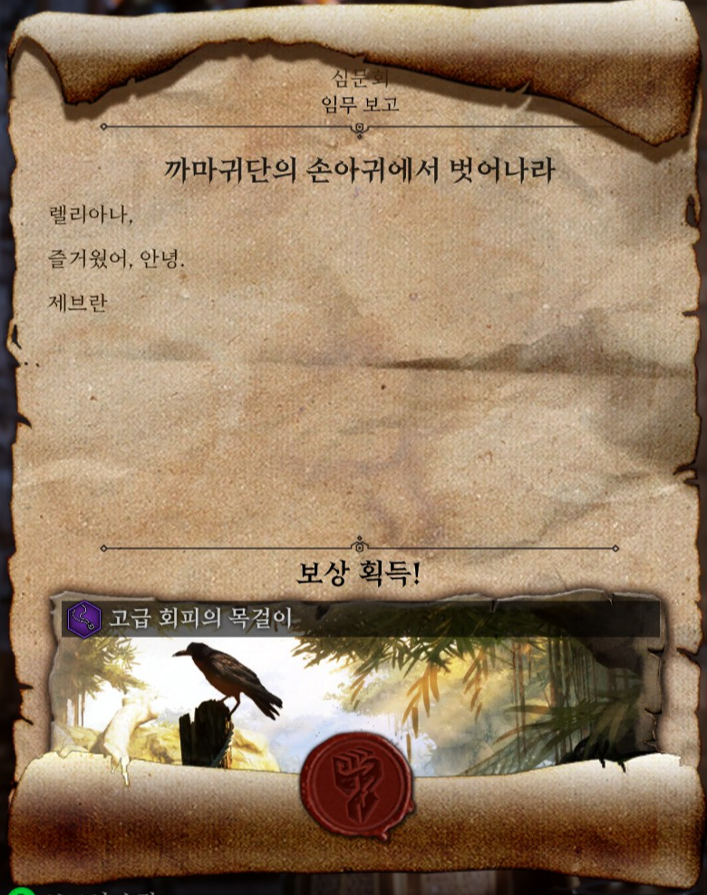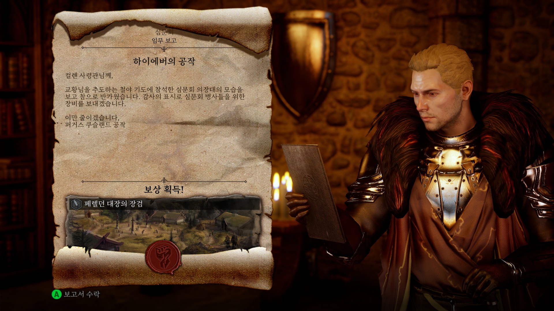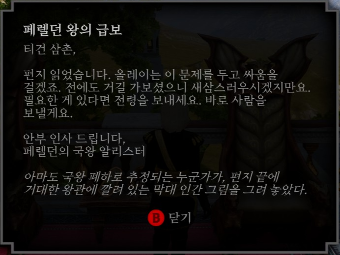 사람은 쉽게 변하질 않는구나 뭔 왕이 편지를 이렇게 써요ㅋㅋㅋㅋㅋ알리스터가 도움 요청했길래 일부러 렐리아나로 보냈는데 특수지문은 딱히 없었다. 어떤 컨텐츠를 통해서도 킹 알리스터 입으로 워든에 대해 이야기를 들을 수 없었다는 점이 조금 아쉬웠다. 이때 인퀴지터는 쩌리고ㅎ 알리스터는 왕이니 사적인 이야기를 하는 게 이상했지만 그럼에도 아쉬웠다. 코덱스에 퍼렐던의 영웅 항목이 있긴해서 조금 위안이 되긴했다.