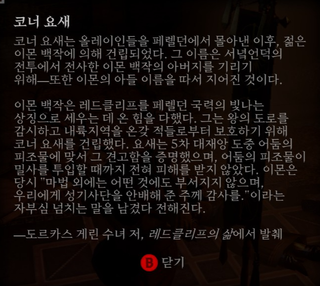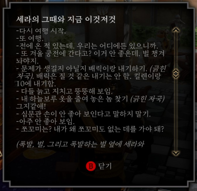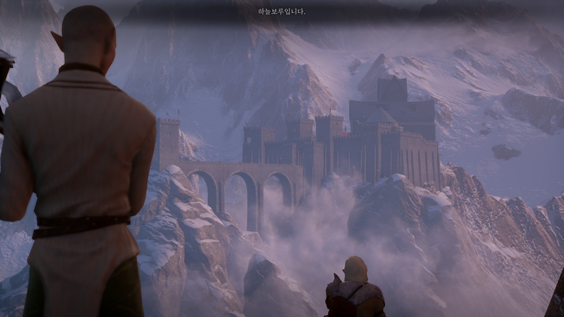 하늘보루 등장 연출이 심장을 쿵쾅거리게 만들었다. 코리피우스한테 습격당했던 날과 다르게 청명한 하늘하며 뒤돌면 보이는 든든한 아군들과 어딘가 산 꼭대기에 오르자 줌아웃하며 주변 풍경을 넓게 보여주는데 스카이홀드라는 설명과 함께 등장한 웅장한 성 하나. 그동안 구박만 받던ㅎㅋㅋ라벨란을 모두가 인정해주고 길잡이라는 역할이 생기고 그게 걸맞는 요새까지 주어졌으니 영웅서사의 시작 아닌가. 심지어 솔라스가 인퀴지션를 인정했고 옆에서 든든하게 받혀주는 듯한 나레이션이라 가슴이 미친듯이 두근거렸다ㅠㅠㅠㅠ설렘 최고조. 다시 생각해보면 정말 미친놈들. 이 장면의 나레이션을 솔라스로 했다는 게 또 도른 것 같다ㅋㅋㅋㅋㅋㅋ드에 전 시리즈 ost 셔플재생중하면서 후기쓰는데 우연히 지금 하늘보루 가는 길 쓰는 중에 journey to skyhold 나와서 또 감상에 젖어들었다. 브금 좋다. 인퀴지션 노래들 다 좋아. 뽕차게 만드는 지점들이 있어.