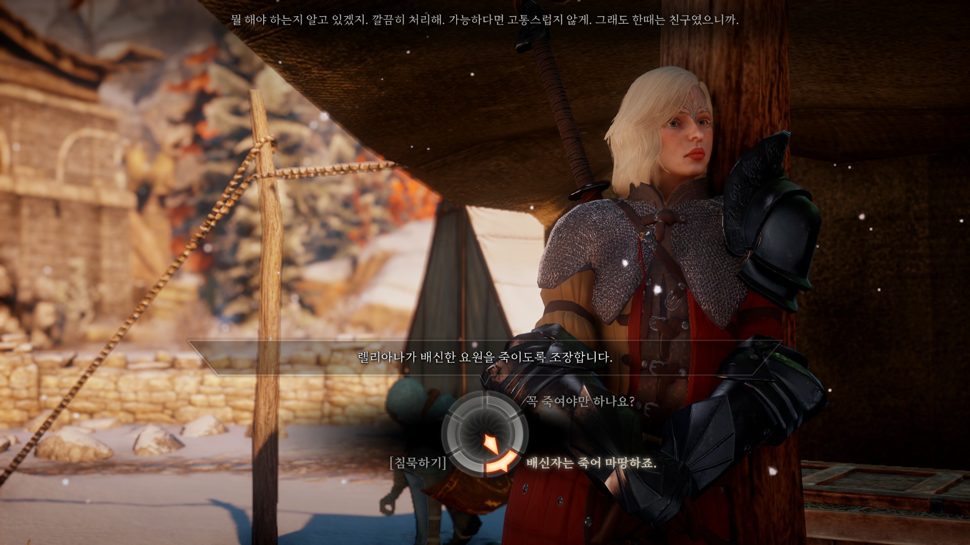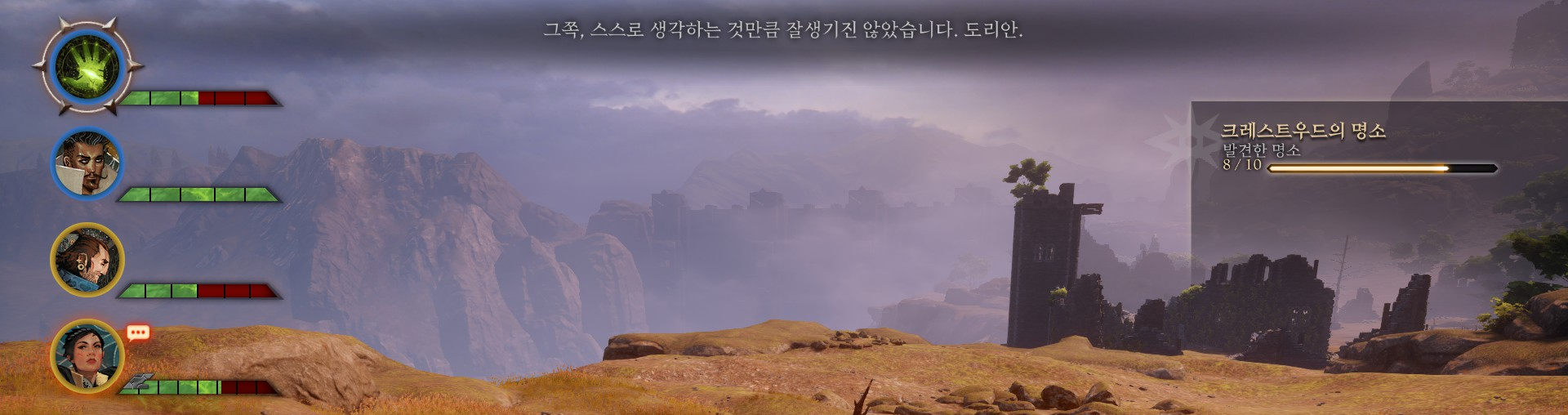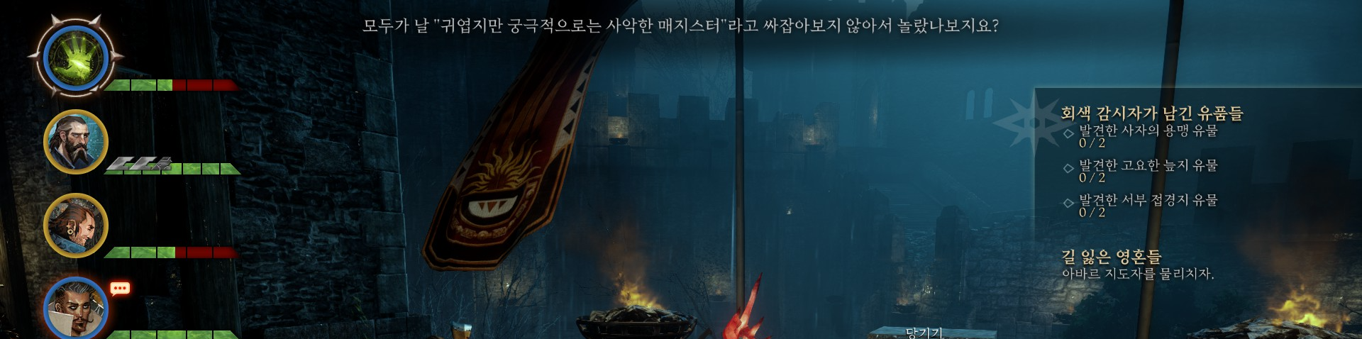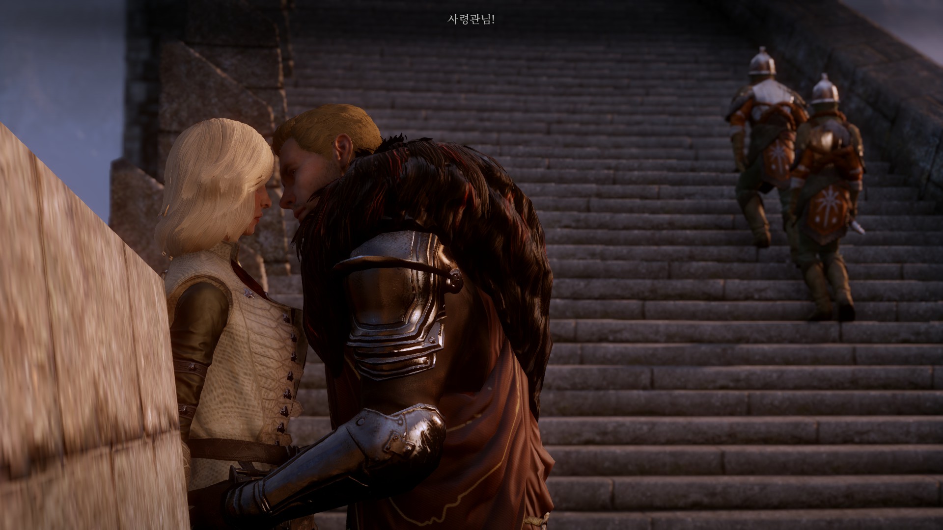 오리진으로 드래곤 에이지를 처음 접한 사람으로서 그 경험이 아니었다면 인퀴지션까지 게임을 하지도 않았을 것이라 장담한다. 내 드에 정체성은 오리진에서 오고 더 미시적인 관점에선 첫 캐릭터인 알리사 쿠슬랜드가 내 드에 인생의 상징이다. 마찬가지로 스포의 개입없이 오로지 내 선택으로만 이루어진 첫 플레이 때 본 알리 희생 엔딩을 가장 최고의 드생(?)으로 여기기 때문에 함께 동고동락했던 회색감시자에 대한 애정이 남다를 수밖에 없었다. 그런데 오랜만에 등장한 회색 감시자가 타락한 모습으로 등장해서 착잡했다. 10년이면 강산도 변하니 그럴 수 있다는 걸 알지만 회색감시자들은 영원한 영웅처럼 목적에 충실한 모습으로 남아줬으면 했다. 난 아직도 알리가 뽀 더 그레이워든~!~!!!!!할 때 심장이 떨린다고ㅠㅠㅠ계속 전설처럼 위대하게 남아있던 집단이 갑자기 내 세대에서 10년만에 변할 일이냐고ㅠㅋㅋㅋㅋㅋㅋ