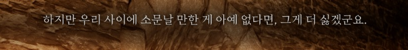 이런 대화도 보면 아이언불한테 용병단이 얼마나 큰 의미인지 느껴진다. 근데 이렇게 살 수도 있는 애를 갠퀘의 선택 한 번으로 그렇게 보낼 수도 있다는 거지? 당연히 쿠나리로서의 자아를 우선시하는 선택이고 아이언 불의 정체성이던 용병단 궤멸은 아이언 불한테 쿠나리만 남게하는 선택이니까 이치에 맞는 흐름이지만 다시 생각해도 소름돋네. 내가 그 선택했으면 솔라스, 블랙월보다 아이언 불이 제일 충격이었을 것 같다. 로맨스까지 했으면 어떡해? 핵불닭 저리가라할 정도로 맵다 진짜