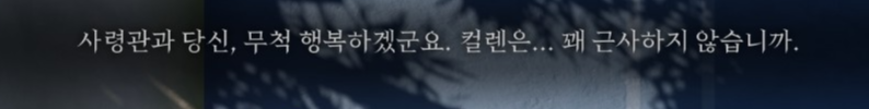'심장에 불꽃이 피리라' 때 컬렌이 어떻게 죽을 지 선택할 수 있는 건 행운이라고 했던 게 머리에 박혔는지 컬렌은 인퀴가 전장에 나가는 것에 큰 반응을 보이지 않을 거라고 여겼었다. 바보같은 생각이었고 ㅋㅋㅋ 이렇게까지 이벤트 하나 통으로 써서 걱정하는 컬렌을 보여줄 줄은 몰랐지. '결국 당신을 전장에 보내야 하군요'라고 말하는 목소리에 걱정이랑 절망이 섞여서 얘가 얼마나 인퀴 사랑하는지 느껴졌다. 인퀴가 돌아오지 못할 지도 모른다는 식으로 말하면 I can't 이러는데 목소리 넘 좋지 않나요. 인퀴를 누구보다 사랑하면서 인퀴가 전장에 나가야 한다는 걸 또 누구보다 잘 아는 사람이라 애틋함이 잔뜩 묻어나오는 연기톤이 미친다고 ㅠㅜ 컬렌은 인퀴가 살아있고 그 옆에 자기가 있으면 뭐든 좋았을 거야.