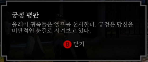 겨울궁전은 재밌는데 재미없는 묘한 챕터. 길을 못 찾아서 얼굴 감싸고 앓았던 유일한 구간ㅎㅋㅋㅋㅋㅋㅋㅋㅋㅋㅋ나의 길치능력이 이렇게 짜증났던 순간이 없다. 지도 좀만 더 신경써주면 안 될까? 나 진자 힘들었어...다른 메인 챕터랑은 결이 달랐고 그간 플레이해 본 게임 중에서도 이렇게 독특한 진행방식은 처음이었던 것 같다. 전투가 있는 rpg게임에서 정치 싸움 요소를 넣고 내가 음모와 계락을 실행할 수 있다니. 내 행동에 따라 평판이 달라지는 것도 신기했다. 아니 근데 엘프라고 초장부터 명성 10 깎이는 건 너무한 거 아닙니까.