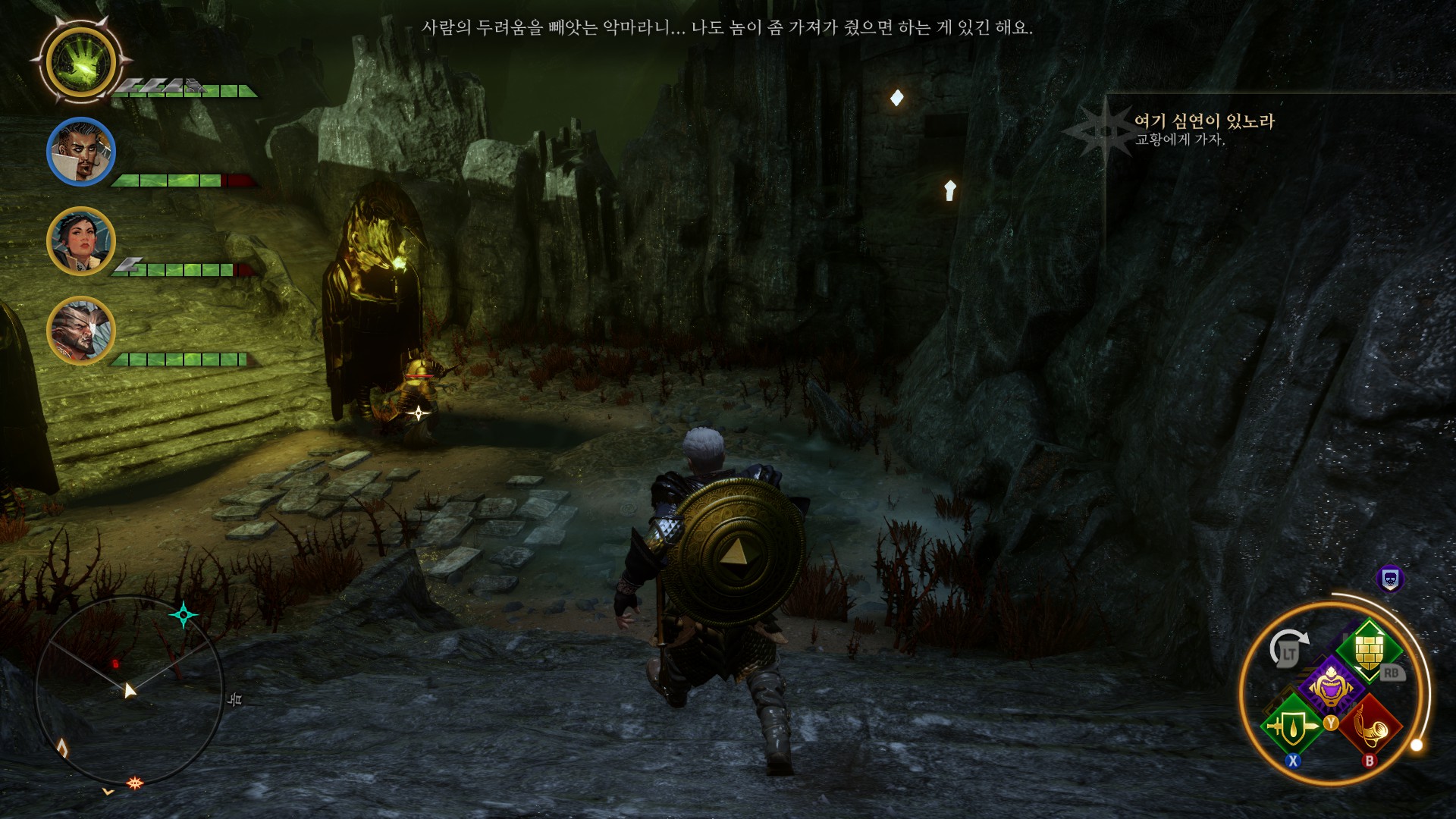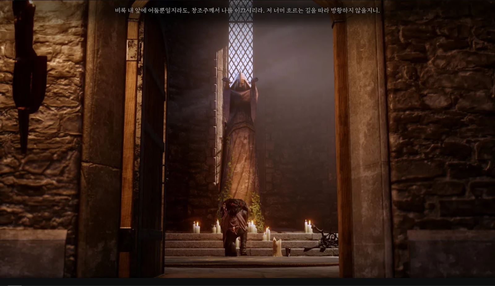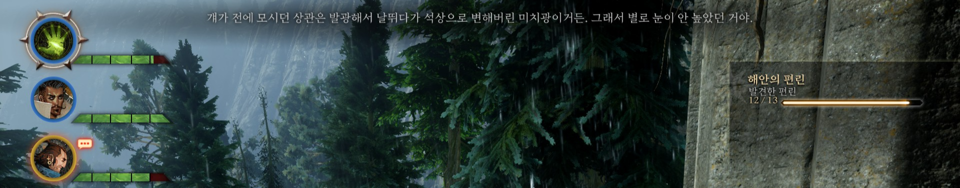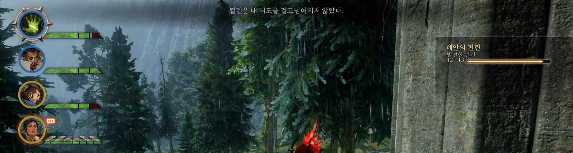 스틱 띡띡 움직이고만 있는 나도 지치게 만드는 연출이라 사람들이 피우고 간 모닥불이나 그냥 나무 조각같은 것만 발견해도 반가운 마음이 들었고 정말로 조언자들이랑 카산드라가 길을 거슬러서 인퀴를 마침내 찾아냈을 때 안도감이 미친듯이 몰려왔다. 그리고 겨우 목숨만 보전한 탓에 다들 사기가 떨어져 있었는데 성가를 부름으로써 모두를 하나된 마음으로 만들었다는 게 참 뭐랄까. 종교란 뭘까?ㅋㅋㅋ 그 전 시리즈까지만 해도 안드라스테고 뭐고 판타지 세계관 속 흥미로운 옛이야기를 보는 느낌이라 게임 내 설정으로만 여겼는데 인퀴지션와서야 하나의 종교로서 느껴졌던 것 같다. 인퀴지터가 전령으로 이름 날린 탓에 자꾸 종교관련 이야기가 나올 수밖에 없던 탓도 있는 것 같구.