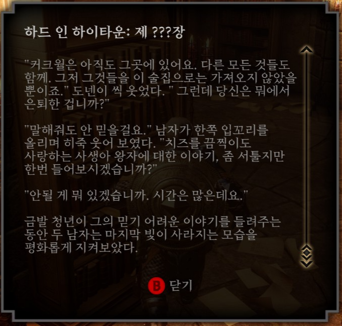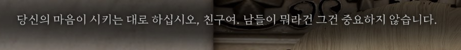 도리안이 팔아먹고 후회하던 목걸이 심문관 권력으로 되찾아주면 도리안이 모두가 이제 너를 이용할 거라고 화낸다. 그때 그러라고 하죠라고 답하면 나오는 대사인데 최애 대사다. Naive and adorable. 정말 어쩔 수 없이 사랑스럽다는 투로 말해서 미칠 것 같음ㅋㅋㅋㅋㅋ