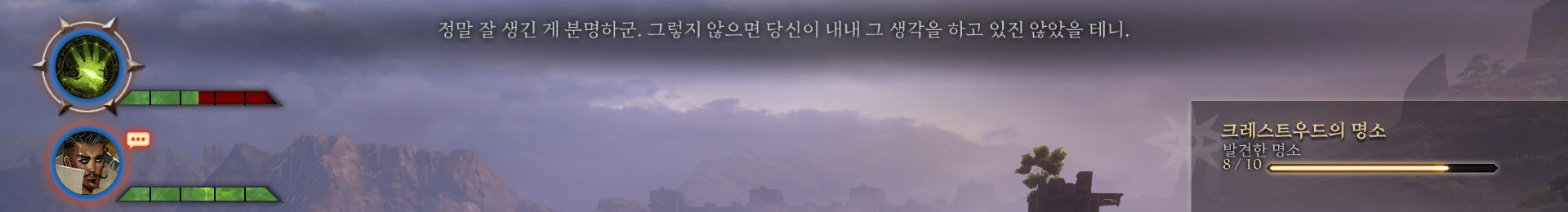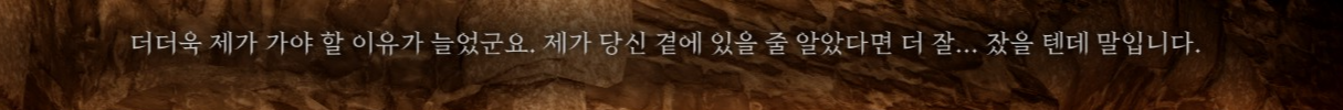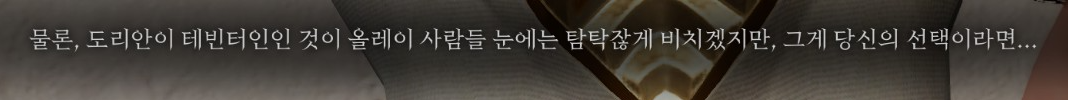 스샷 찾다가 포기했는데 신전 이후로 테빈터로 떠나겠다고 선언할 때 도리안 대사도 좋다. 인퀴의 업적에 영감을 받아서 테빈터로 돌아갈 생각뿐만 아니라 테빈터를 바꿔놓겠다고 결심하는 서사 벅차오른다. 테빈터가 더 나아질 수 있다는 걸 증명할 수 있다면 뭐든 하겠다는 대사 스스로 가시밭길 걸어가겠다는데도 도리안이 그럼에도 얼마나 고향 사랑하는지 느껴져서 보내줄 수밖에 없음. 이 모든 것이 인퀴의 잘못이라고 말하는 도리안의 표현 아이니함도 묻어나고 애정도 드러나서 좋아한다. 많은 시간을 함께 보내며 서로 영향 받았기 때문에 떠나기를 결심한 관계 로맨스를 빼고 봐도 좋다. 곁에 항상 있지는 못할 망정 지금의 도리안을 만들어낸 경험에 인퀴가 영원히 존재한다는 거잖아.