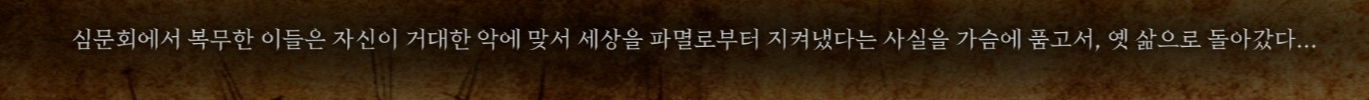 후일담 보니까 또 조금 괜찮았던 건 자신이 인퀴덕에 얻게 된 이후의 인생을 의미있게 살아가려고 했다는 점? 그리고 회색감시자가 되겠다고 말한 걸 지켰다는 점.