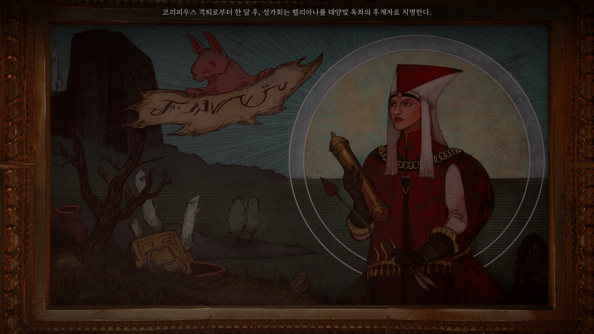 또 왔다. 중요 인물 선정하기. 근데 꼭 카산드라, 렐리아나 중에 뽑아야하냐구요. 게임한 지 좀 되어가지고 애들 신념이 어땠는지 정확하게 기억이 없네. 렐리아나가 급진 개혁파면 카산드라는 그에 비해 보수적이었던 것 같다. 비비엔도 교황 추대되던데 비비엔은 대놓고 마법사 협회 부활이라 앤더스때문이라도 밀어주진 못했다. 카산드라가 추구하는 과거의 좋은 점은 취하되 나쁜 점을 개선하는 길을 잘못하면 예전의 잘못을 답습하게 될 위험성이 크지만 그래도 카산드라니까 잘 해내지 않을까싶어서 카산드라를 좀 더 응원하게 되었다. 2회차는 카산드라 교황 만들었는데 렐리아나가 옆에서 또 첩보대장 노릇하고 있더라. 렐리아나가 암살 및 기타 음지 업무에서 벗어날 수 있는 건 교황이 됐을 때밖에 없는 것 같아서 렐리아나 교황 세계관을 밀게 됐다. 우리 애 제발 암살 좀 그만 시키세요...