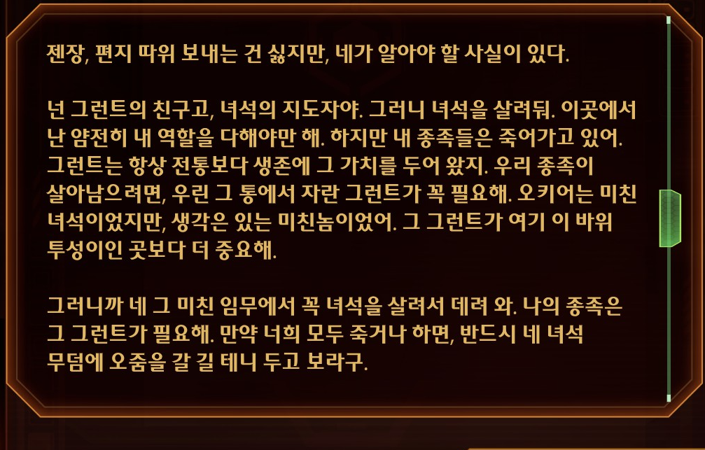 뒤에 띄엄띄엄 붙이기 애매해서 동료퀘 이야기도 같이. 개러스는 동료퀘에 대한 인상은 흐린데 상호작용이나 다른 부분에서 너무 강렬한 나머지 컴퓨터 끄면 개러스가 제일 기억에 남는다.