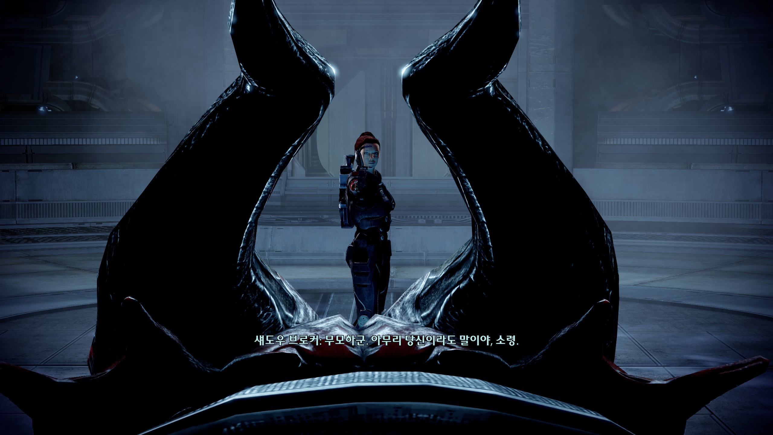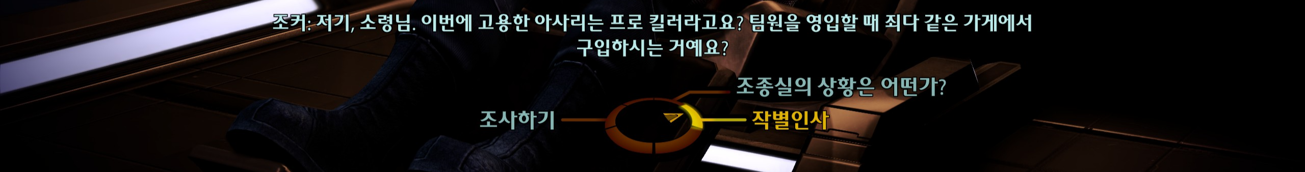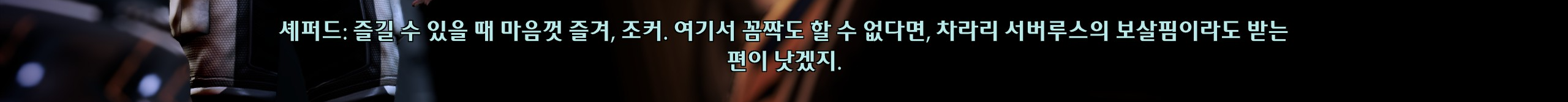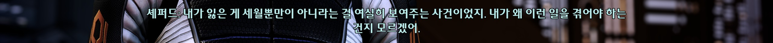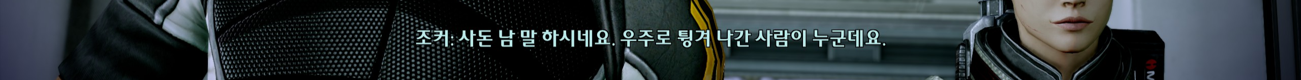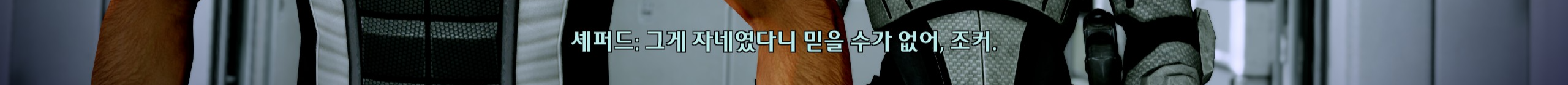 이후로 남은 섭퀘 하던 중에 또! 강제로 스토리가 진행됨. 콜렉터들이 승무원들 다 잡아가는데 내가 조종할 수 있는 캐릭터는 셰퍼드가 아닌 유리몸뚱이를 가진 조커라서 엄청 떨면서 했다. 조커 빼고 전원 다 잡혀갔다는데 아니 왜 세퍼드는 그 많은 동료중에 핵심멤버를 단 한 명도 두고가지 않았던 걸까. 조커가 셰퍼드 원망하는 것도 이해됨.