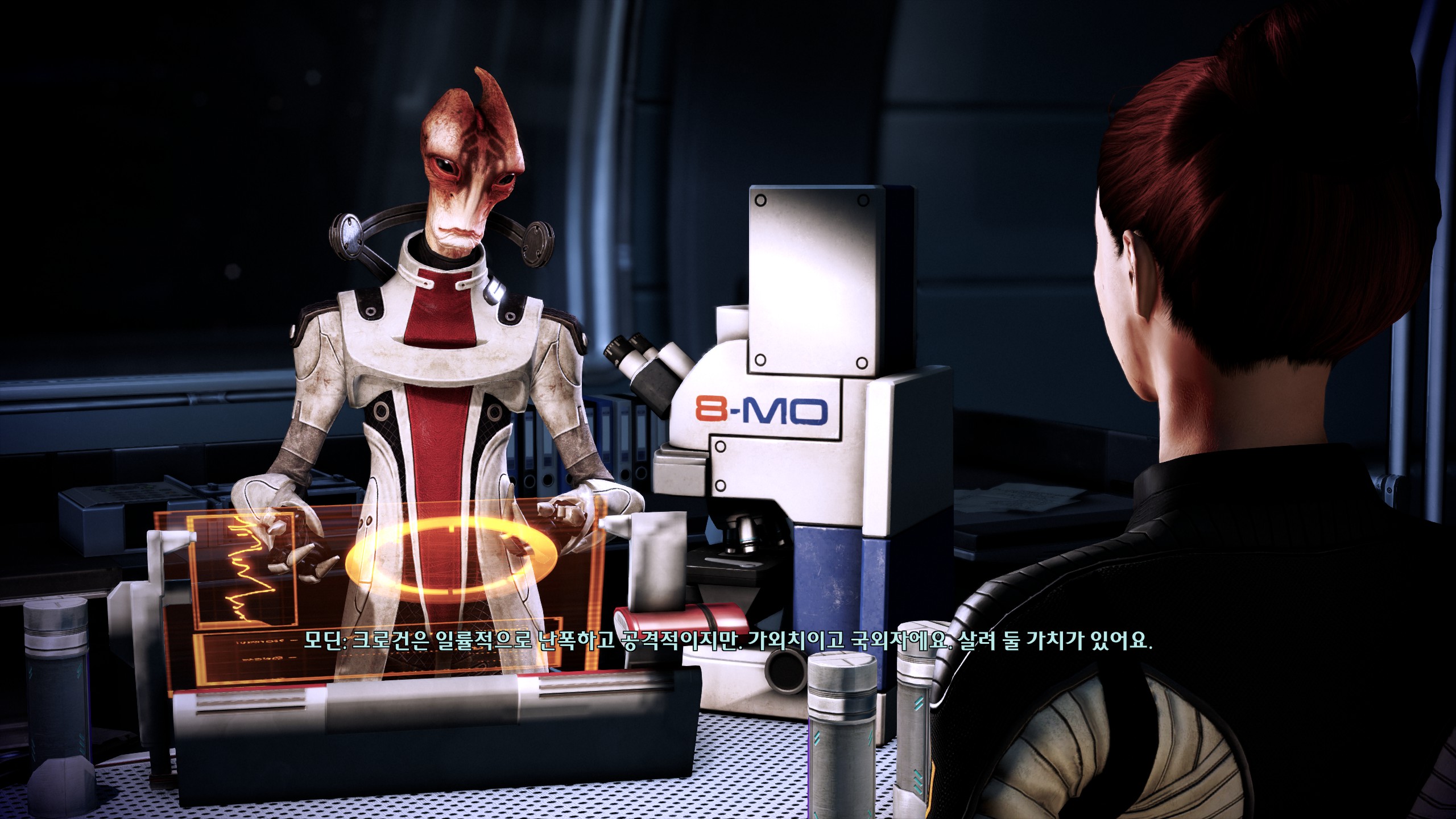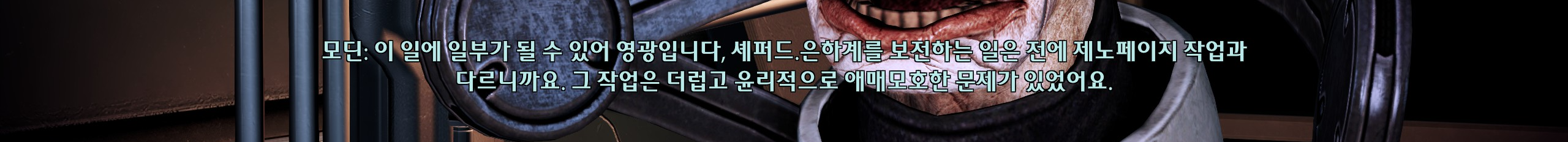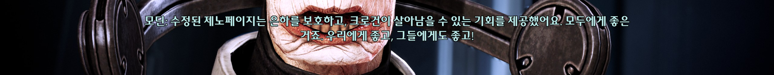 갑작스럽게 투하된 비설. 오메가에서 병 걸린 사람들 치료해주려고 마지막까지 버티고 있어서 좋은 사람이라는 인식이 박혀있었는데 갑자기 제노페이지 만들었다길래 렉스가 말한 그 제노페이지?이러고 인지부조화왔었다. 샐러리안 수명도 짧은데 얼마나 압축된 삶을 사셨던 거예요. 모딘 정이 들다말다했던 이유도 전부 제노페이지때문이었다. 렉스가 고생하는 걸 봐서 어쩔 수 없이 크로건 편을 들게 되기도 하고 적절한 인구수 조절, 살려둘 가치같은 말들이 크로건을 비인격적인 대상으로만 보는 것 같아 불쾌했다. 그래서 동료퀘할 때 메일론 했던 실험은 잔인했어도 말하는 건 전부 공감갔다.