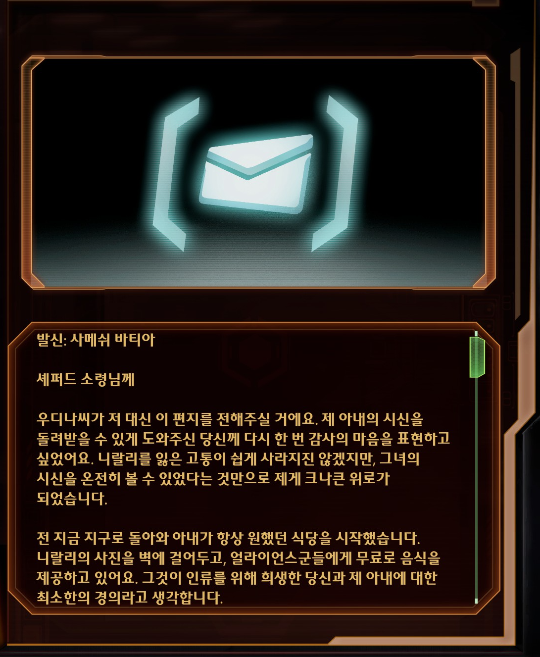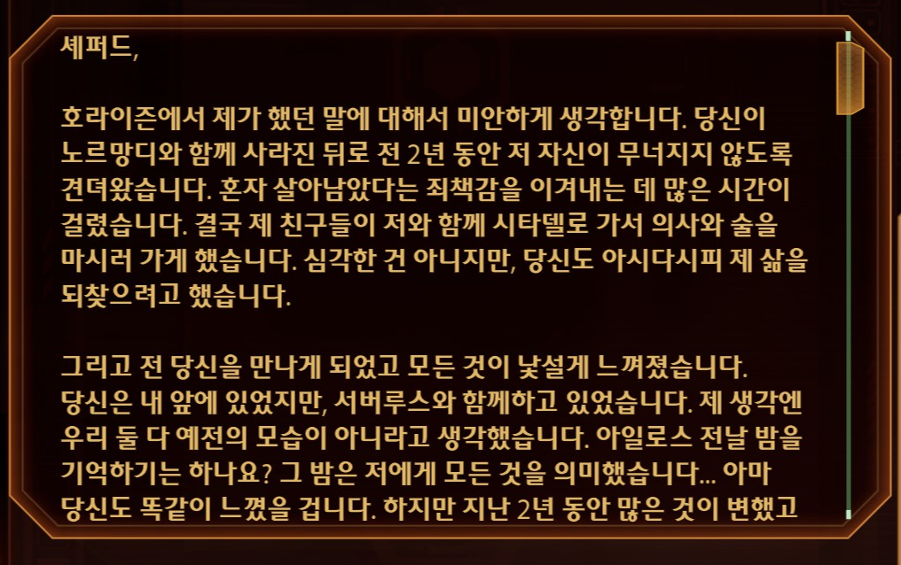 심지어 모든 일이 끝나면 아마도 라고 했잖아. 쟤도 미련 철철 넘치잖아. 몸 조심하라잖아ㅠ편지 읽고 나니까 마음 풀어져서 케이든 입장을 이해해보려 노력했다. 셰퍼드야 눈 감고 일어나니까 2년 후딱 갔지만 케이든 입장에서 생각하면 사별 심지어 같은 공간에 있었는데 구하지 못한 죄책감에 빠져살다가 겨우 괜찮아지니까 살아있었다는 소식 들려서 배신감들고 게다가 서버루스랑 같이 행동하고 있다니까 마음 복잡했겠지. 의외였던 점이 있다면 바이오틱은 할 만한 직업이 없어서 소거법으로 군대 입대하는 바람에 직업 소명없는 줄 알았는데 생각보다 투철했다는 점? 편지 읽으니까 약간 희망이 보여서 엔딩 때 뭐라도 있는 거 아닌가 싶어졌다. 내 의지와 상관없이 차이니까 오히려 질척이게 됨. 그래서 수절했어요. 업적을 버리고 서사를 얻다.