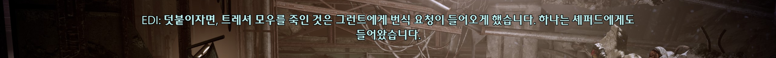 마지막 전투는 세런이 허스크되는 건 봐도봐도 너무 징그럽고 애가 이리 폴짝 저리 폴짝 벽, 바닥 가리지 않고 기어다니는 게 너무 소름돋게 징그러워서 잡몹은 신경도 안 쓰고 세런한테만 냅다 총 갈기다가 끝났다. 소버린 잔해에 죽은 것처럼 보였던 셰퍼드가 마지막에 혼자 걸어나오는데 떠먹여주는 걸 알면서도 주인공 뽕이 차오름.