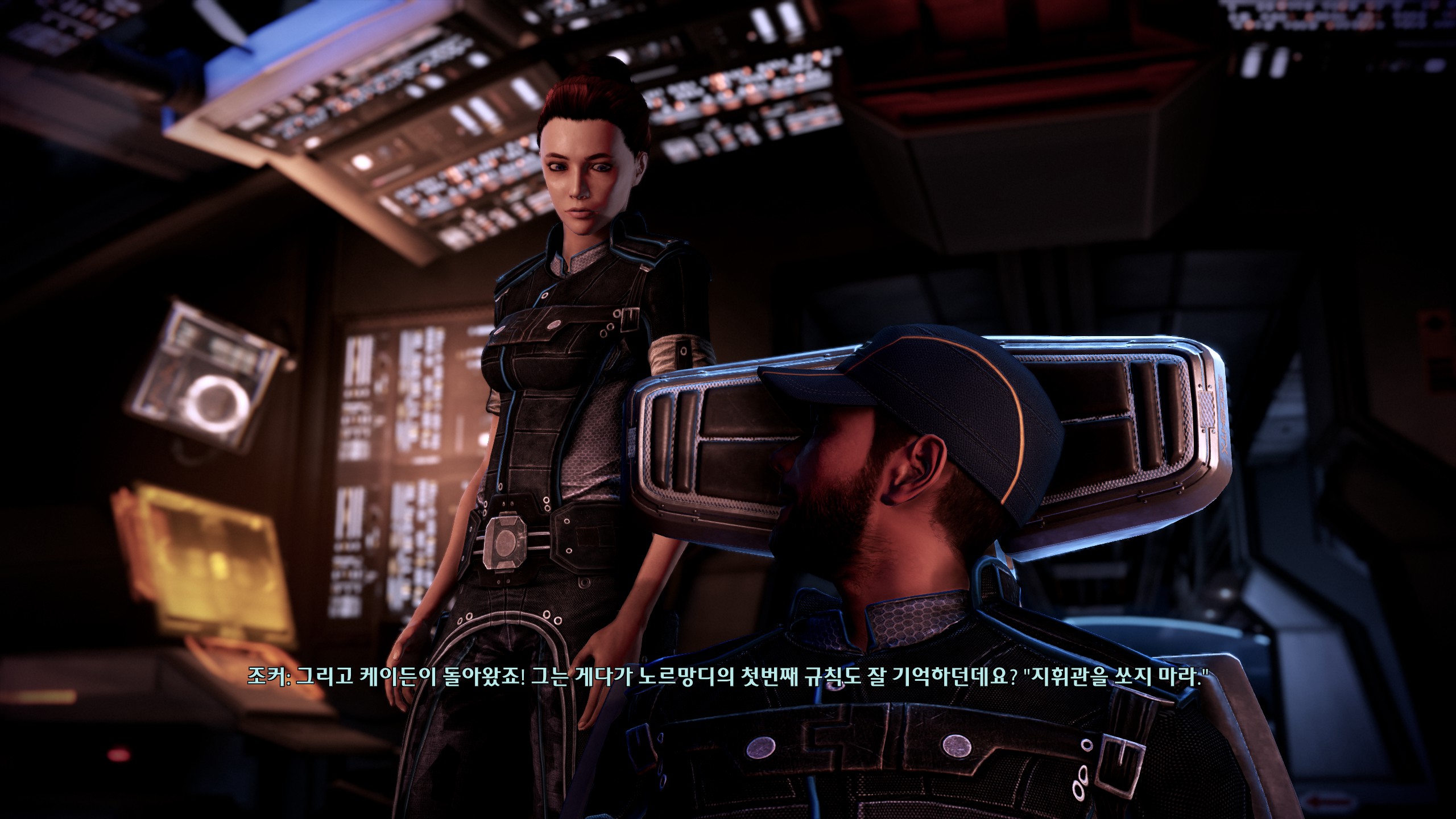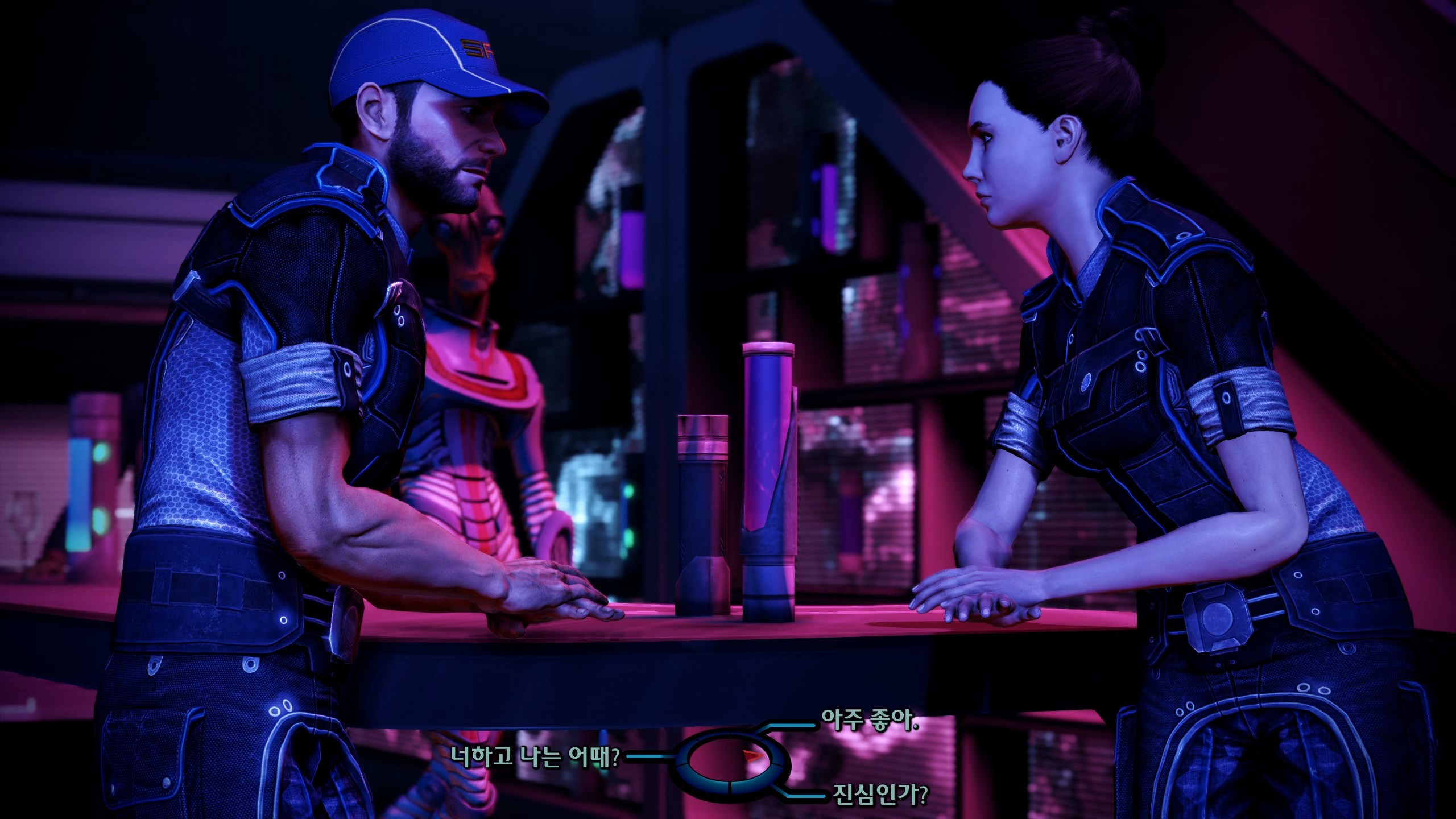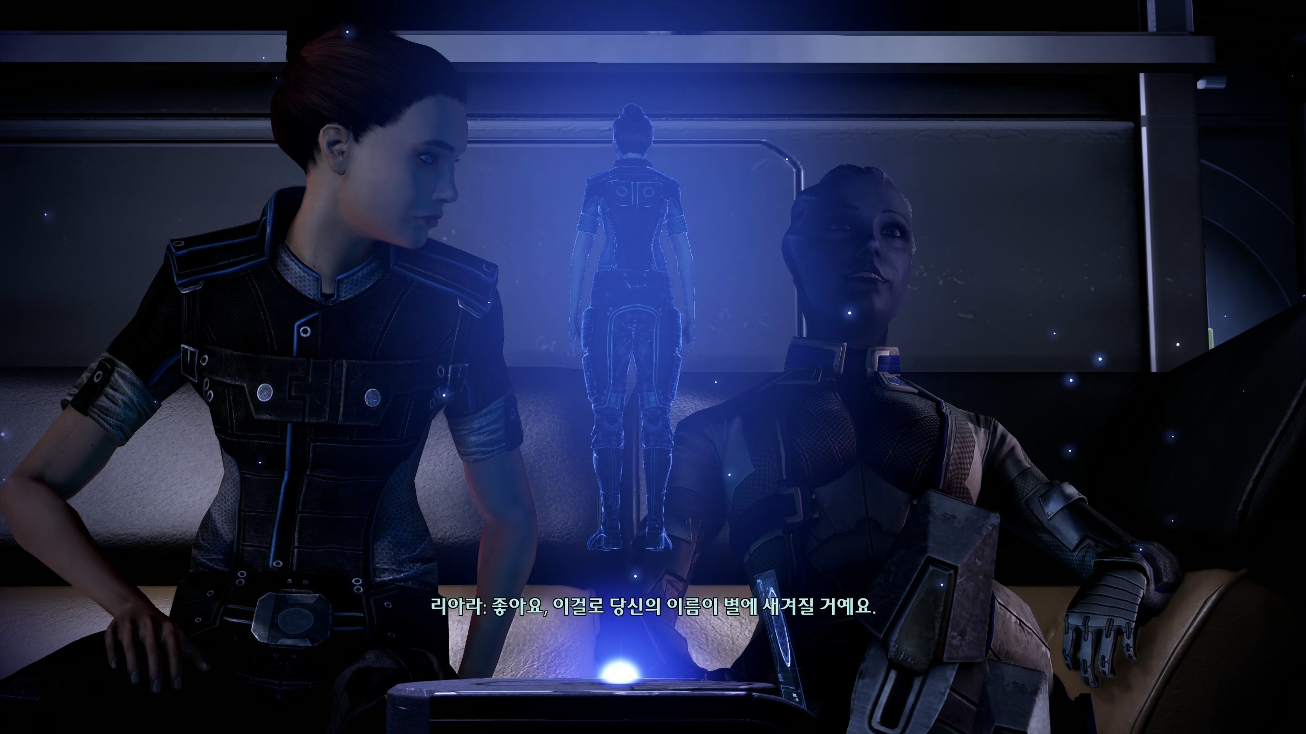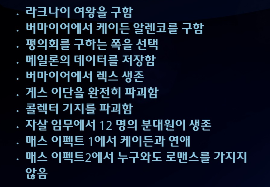 이후 마지막까진 뒤돌아보지 않고 쭉 달려서 스샷도 없다. 모든 이벤트를 싹싹 긁어먹어서 코르테즈도 미란다도 무사히 살렸답니다. 당연한 전개인 줄 알았는데 나중에 보니까 신경 안 쓰면 죽는 분기가 있어서 놀랐다. 막전투전에 셰퍼드 과로 막으려고 퀵 드링크라며 함장실 찾아온 케이든이 너무 귀여웠다. 사실 거짓말이었다고 붙잡는 것도 귀여워. 내조 너무 잘 함ㅋㅋㅋ