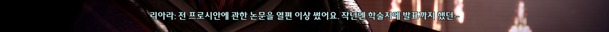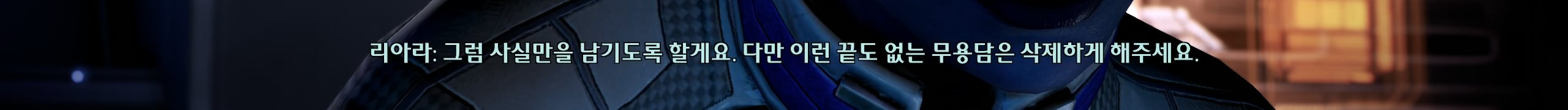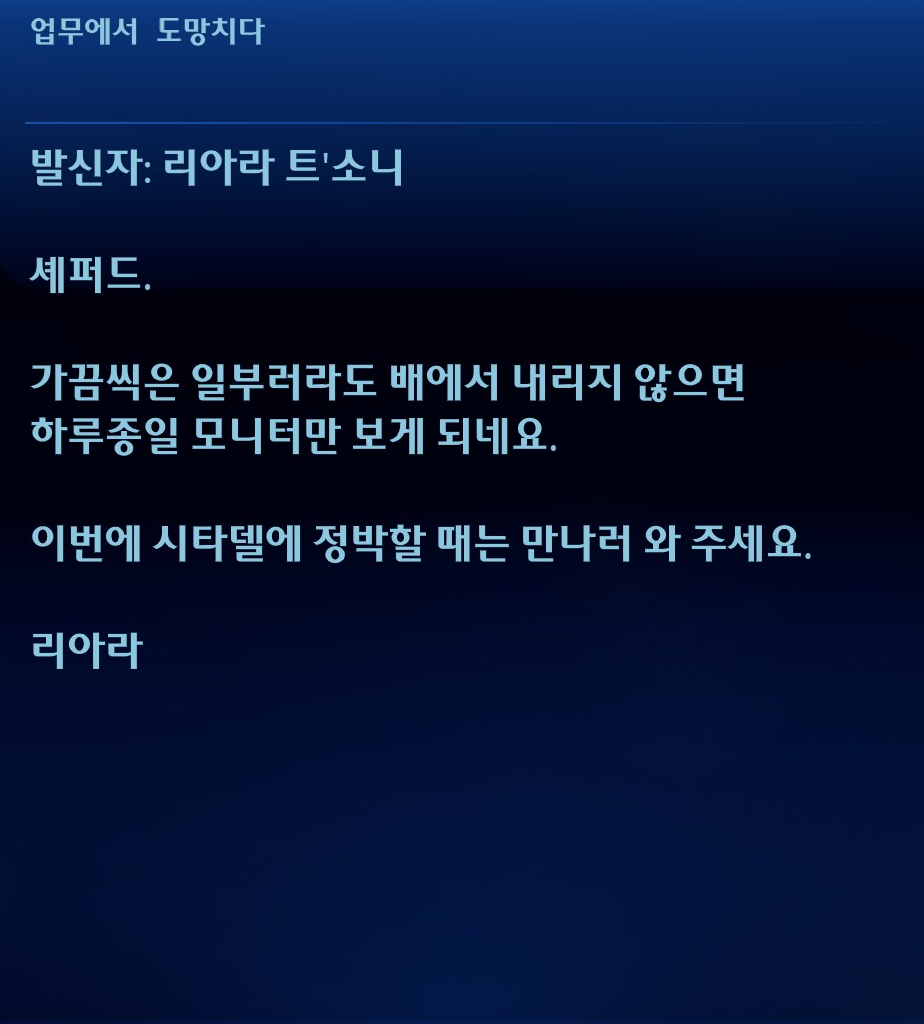 개러스-셰퍼드가 담백하다면 리아라와는 좀 더 달짝지근한 분위기가 있다. 우정이 맞긴한데 사랑도 약간 첨가된 것 같아. 뭐 눈엔 뭐만 보인다던데 내 눈에 필터 씌어져서 그런가? 그리고 아무리 생각해도 리아라가 섀도우브로커 일을 잘 하는 것이랑 무관하게 평범한 고고학자로 살았으면 더 행복했을 것 같다.