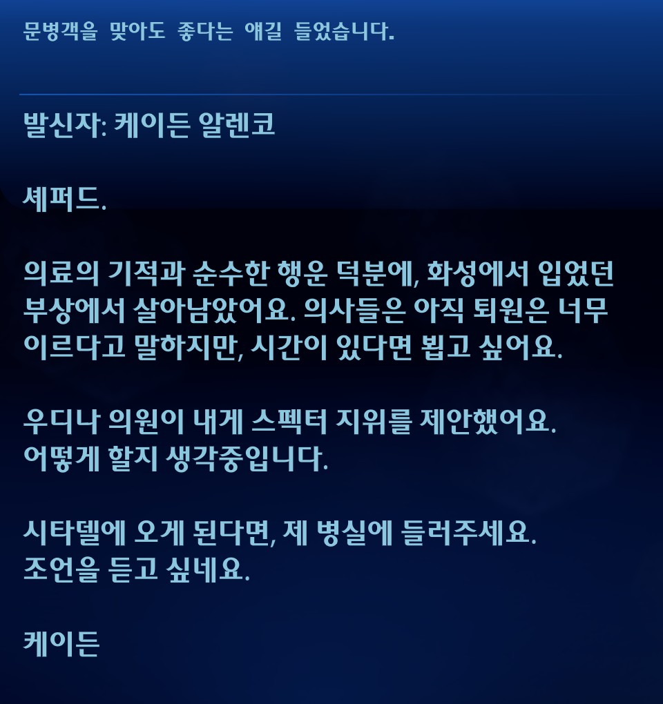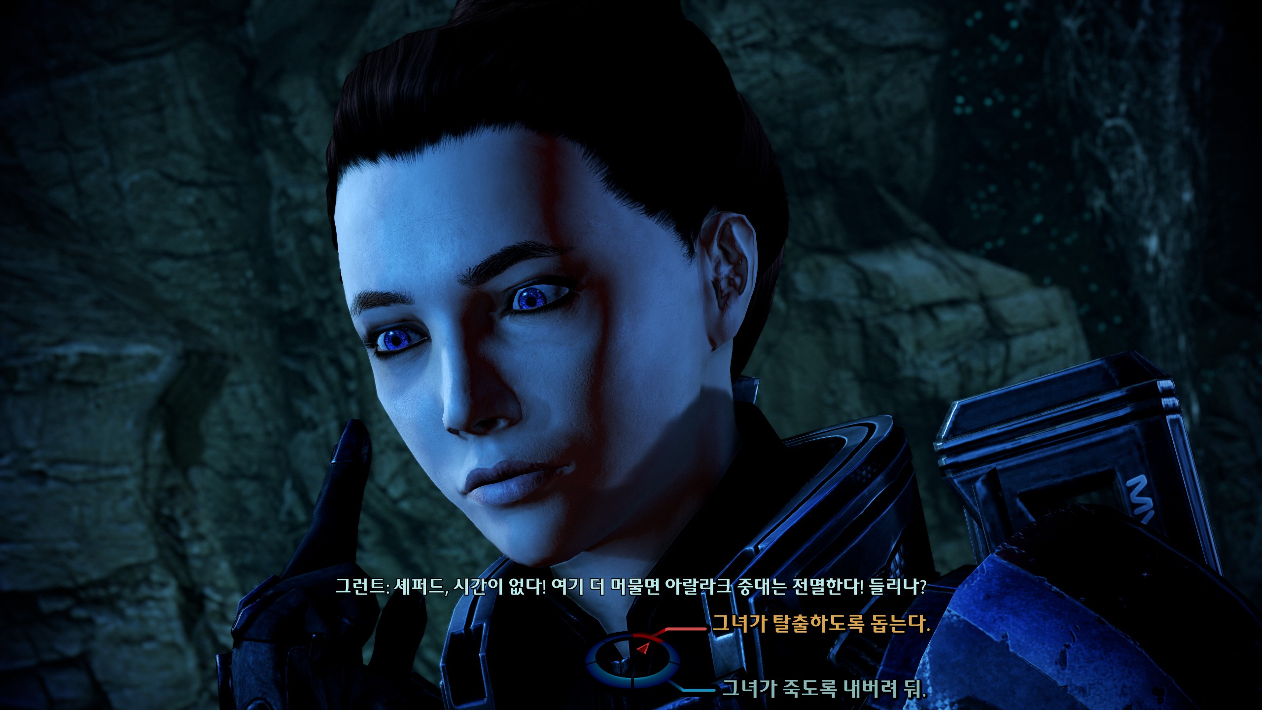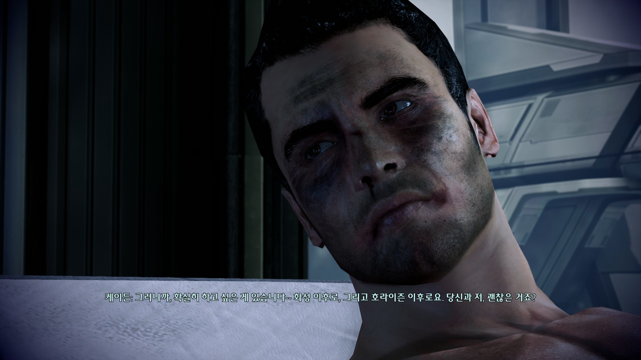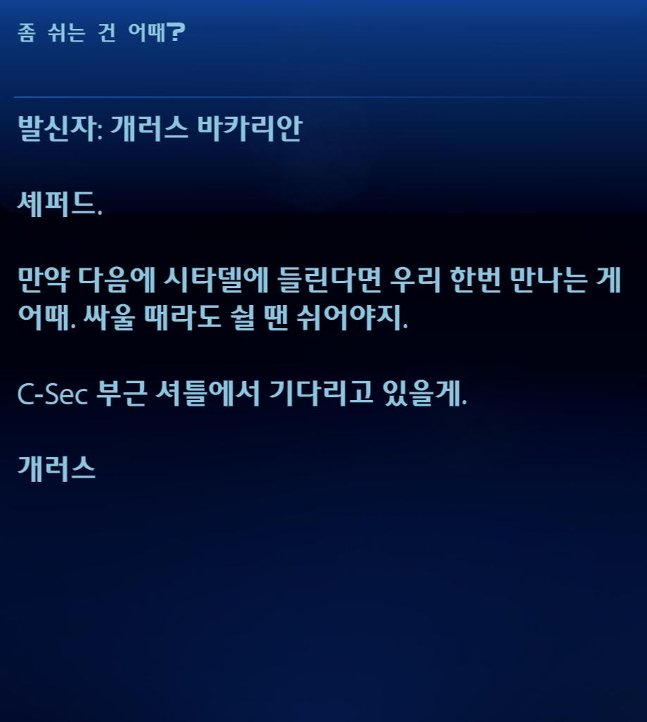 여기서 케이든 설득이 안 되면 케이든을 쏜다던데 전개 왤케 매워요? 셰퍼드랑 적대해도 본인 신념 지키는 걸 보면 진짜 대쪽같은 캐릭터야. 시타델 전투 끝내자마자 병원부터 달려감. 왜 항상 나쁜 예감만 틀리지 않는지.