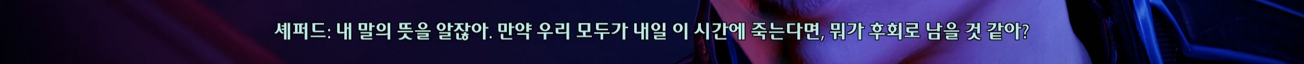 리아라의 특성을 살리면서 셰퍼드에 대한 애정까지 묻어나는 이벤트. 리아라가 고고학자이기 때문도 있지만 아사리라 미래를 생각할 수밖에 없기 때문에 셰퍼드를 기록하고싶어하는 것 같기도 하다. 모두가 죽은 이후를 생각할 수 있는 건 리아라밖에 없어ㅠ