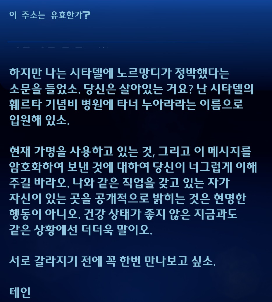 시한부 판정 받은 줄은 알았지만 테인을 병원에서 만나니까 기분이 이상했다. 대화할 때마다 기침을 하는데 아무리 겜캐라도 누군가 병들어가는 모습을 지켜보는 건 괴롭다. 게임 캐릭터가 병사하는 과정을 지켜봐야한다니. 애매하게 입원으로 이야기를 마무리짓진 않을 것 같고 스토리 진행하다보면 무조건 죽을 것 같았다. 그렇다고 그런 끝을 예상한 건 아니었음ㅎ