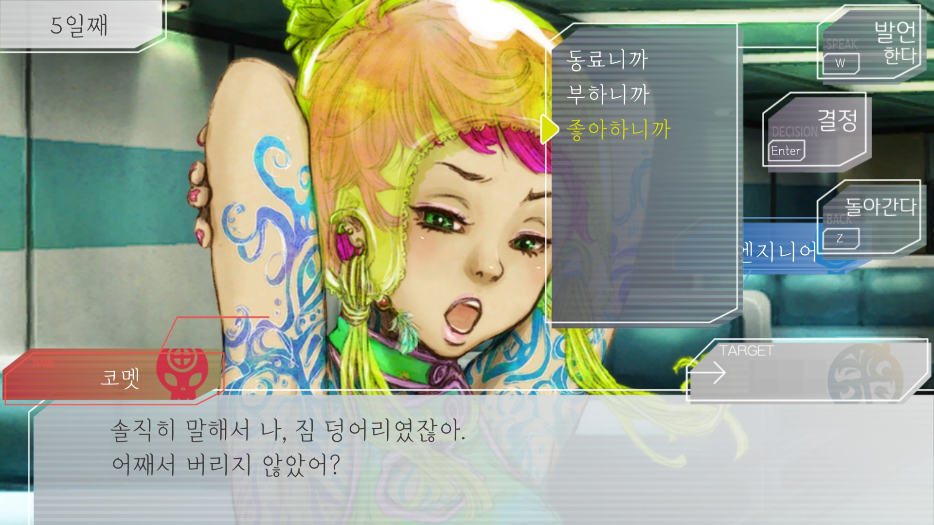 어느날 느낌표 떴길래 가봤더니 왜 자기를 감쌌냐고 묻는거임 ...제가요?ㅋㅋㅋㅋㅋㅋㅋㅋㅋ이쯤엔 루프 질려서 무뇌 플레이를 하고 있었기 때문에 내가 무슨 커맨드를 썼는지 기억도 안남ㅋㅋㅋㅋ근데 발언에 좋아하니까가 있어서 연애 이벤트 각을 봤다.