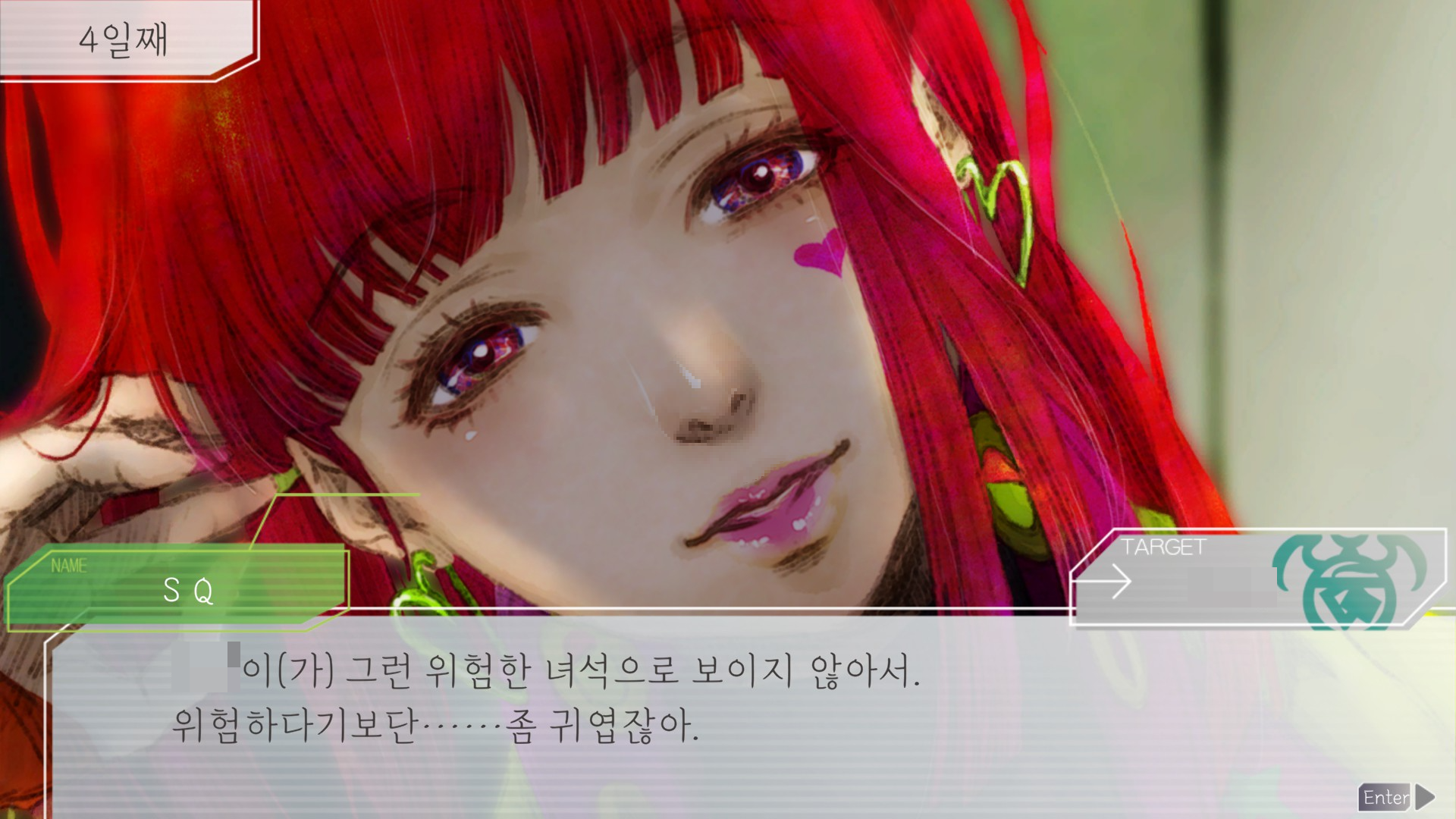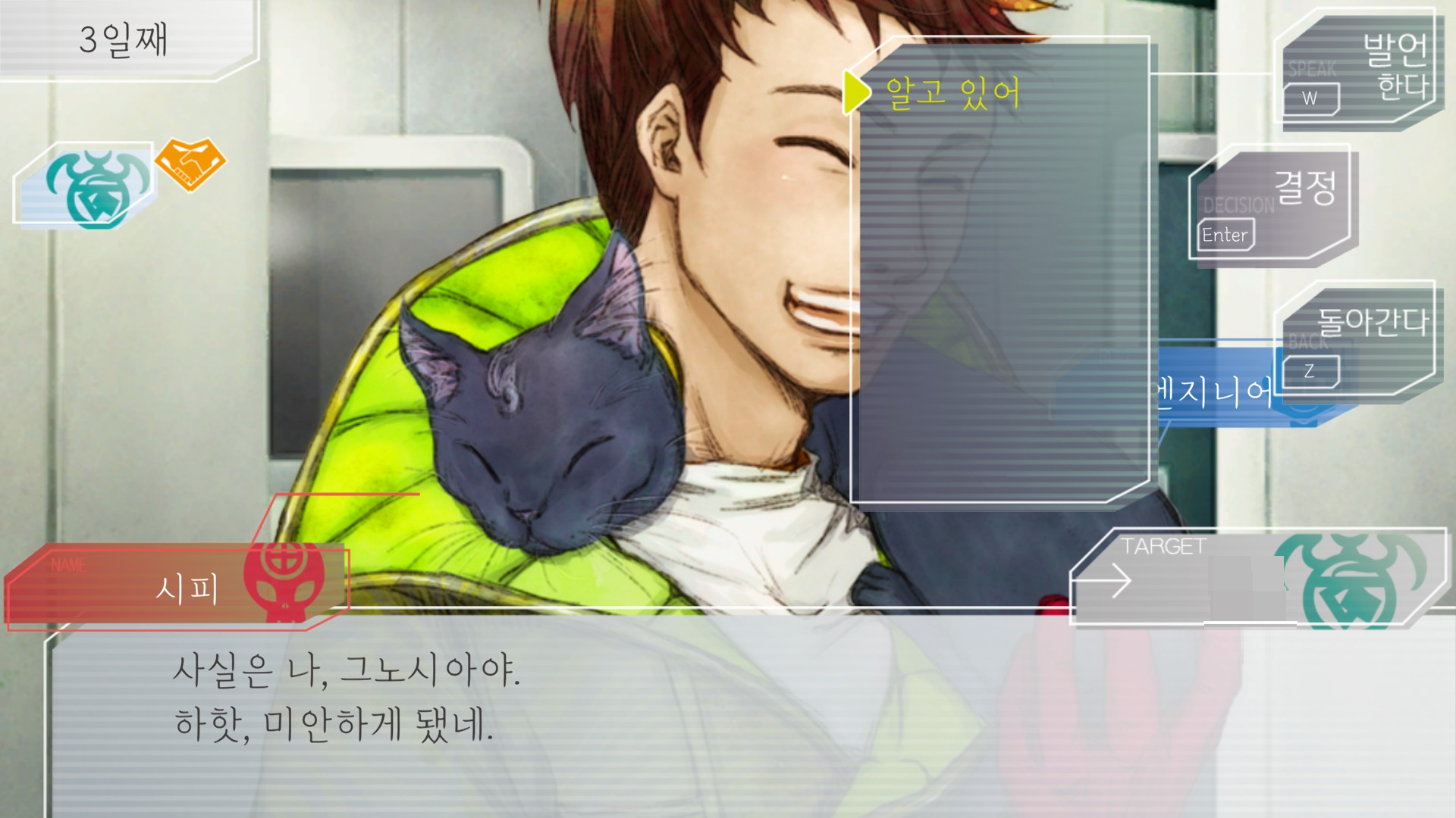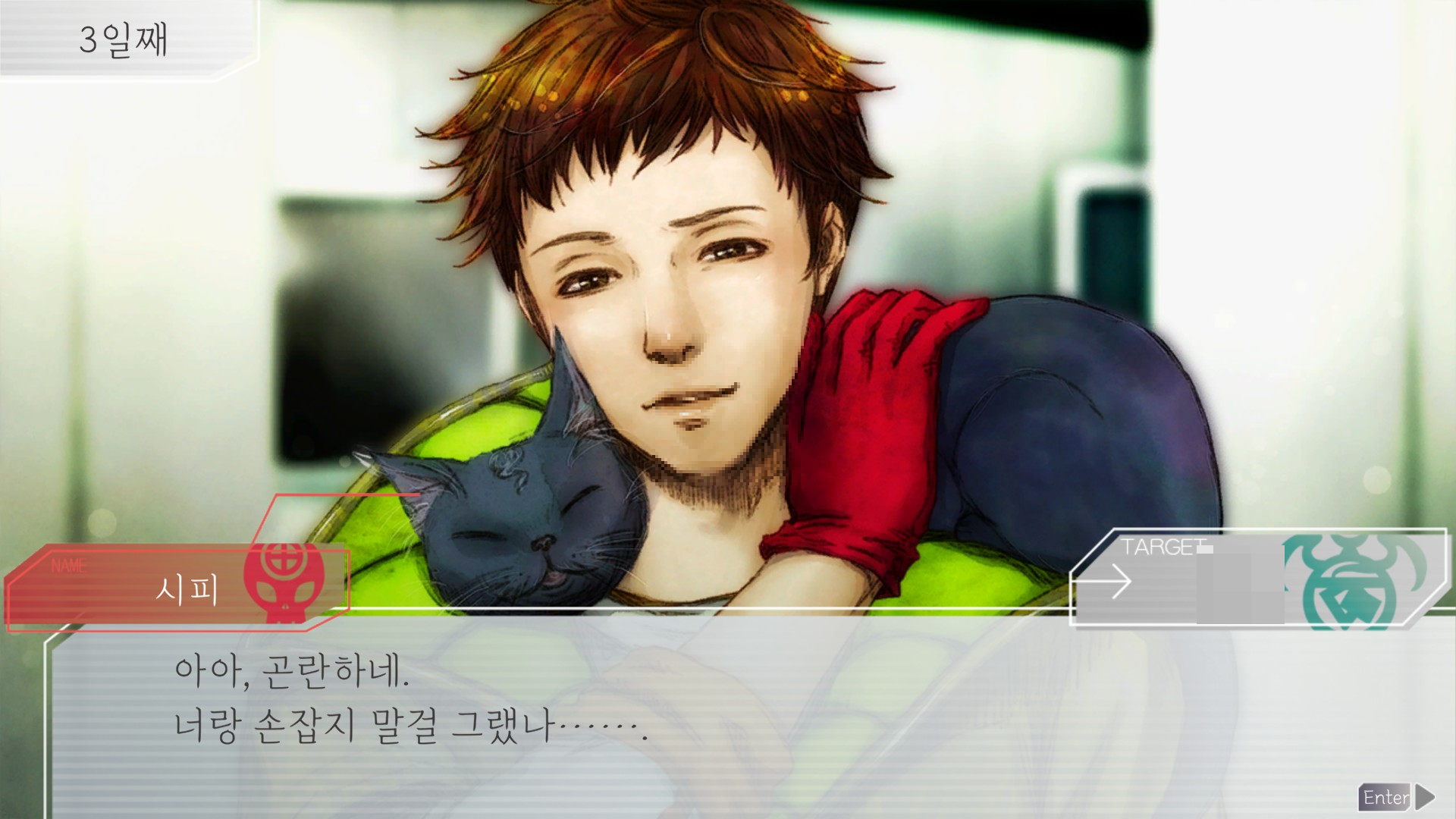 시피는 고양이라ㅋㅋ사람한테 성애적 사랑을 느끼진 않을테고 플레이어가 그런 마음인 걸 눈치채도 대답 못해주지만 그래도 인간적?묘적? 죄책감과 호감은 느꼈다는게 좋음. 걍 죽일 생각이었던 애가 저렇게 흔들린다는 사실 하나만으로 성과는 있었다.