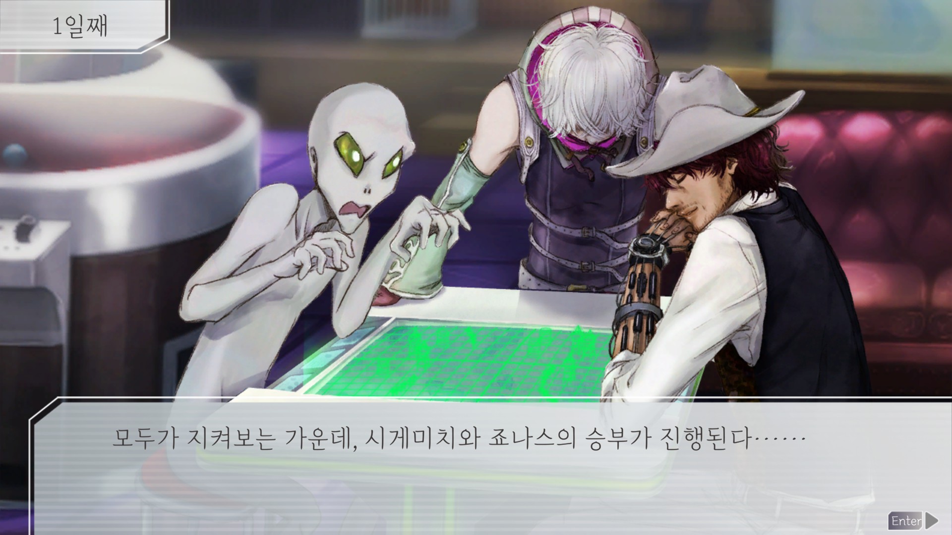 초반엔 추리도 안하고 대충 눌렀는데 1회차 때 못 본 대사나 CG도 나오길래 그거 구경하는 맛에 또 열심히 하다보니까 그 날이 오긴 왔다.
