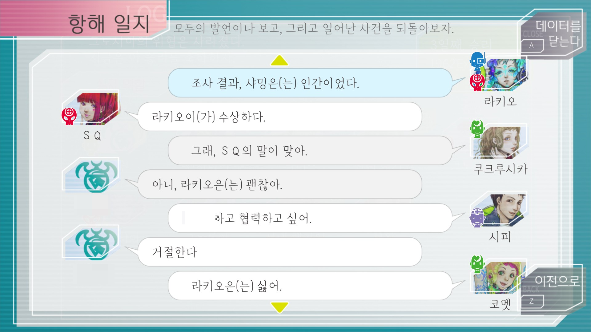 이 이벤트는 진짜 놀랐다ㅋㅋㅋㅋㅋㅋㅋ엥엥엥으잉?????하고 끝난 이벤트 이런 강제 이벤트는 처음이라 더더욱. 쿠크루시카 무해한 아기인 줄 알았는데 이 뒤론 소름돋았구 그녀의 정체를 안 지금은 껍데기가 이렇게 중요하다는 걸 다시 한 번 깨닫습니다. 여전히 귀엽달까?ㅋㅋㅋ유리코만큼 쿠크루시카 적으로 만나면 너무 짜증남 좀만 의심하면 슬퍼한다 시전하는데 그때마다 고구마 2000개 처먹은 기분. 내가 엔지니어라 쿠크 그노선언해도 제일 마지막에 죽음ㅋㅋㅋㅋㅋㅋㅋ아니면 왜 의심하냐며 내가 콜드슬립당하거나 죽거나 둘 중 하나...그나마 내가 그노시아일 땐 걍 죽이면 되는데 선원일 땐 죽이지도 못하고 대환장쇼 개막이나 다름없다. 거기에 유리코가 쿠크 편을 든다? 걍 죽여줘만 외침ㅋㅋㅋㅋ