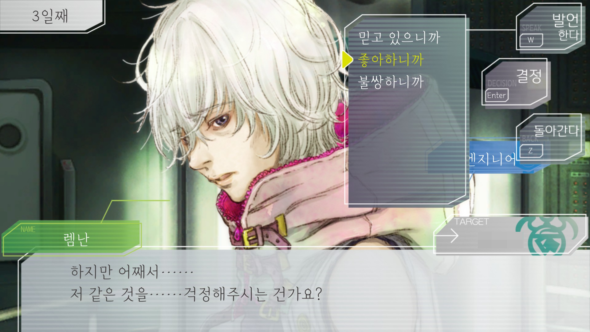 카모카테에서도 루죤한테 뽀뽀했다가 망해버렸던 기억이 떠올랐다. 렘난도 마난한테 좋아한다는 이유로 당한게 많으니 그런 감정을 바로 말하는 건 싫어할만 하다는 생각이 들어서 신뢰부터 쌓는게 맞는 공략루트라는 생각이 들었음. 그래서 다음엔 믿으니까로 커맨드를 바꾸고 특기사항을 수집하고 그 판이 끝남.