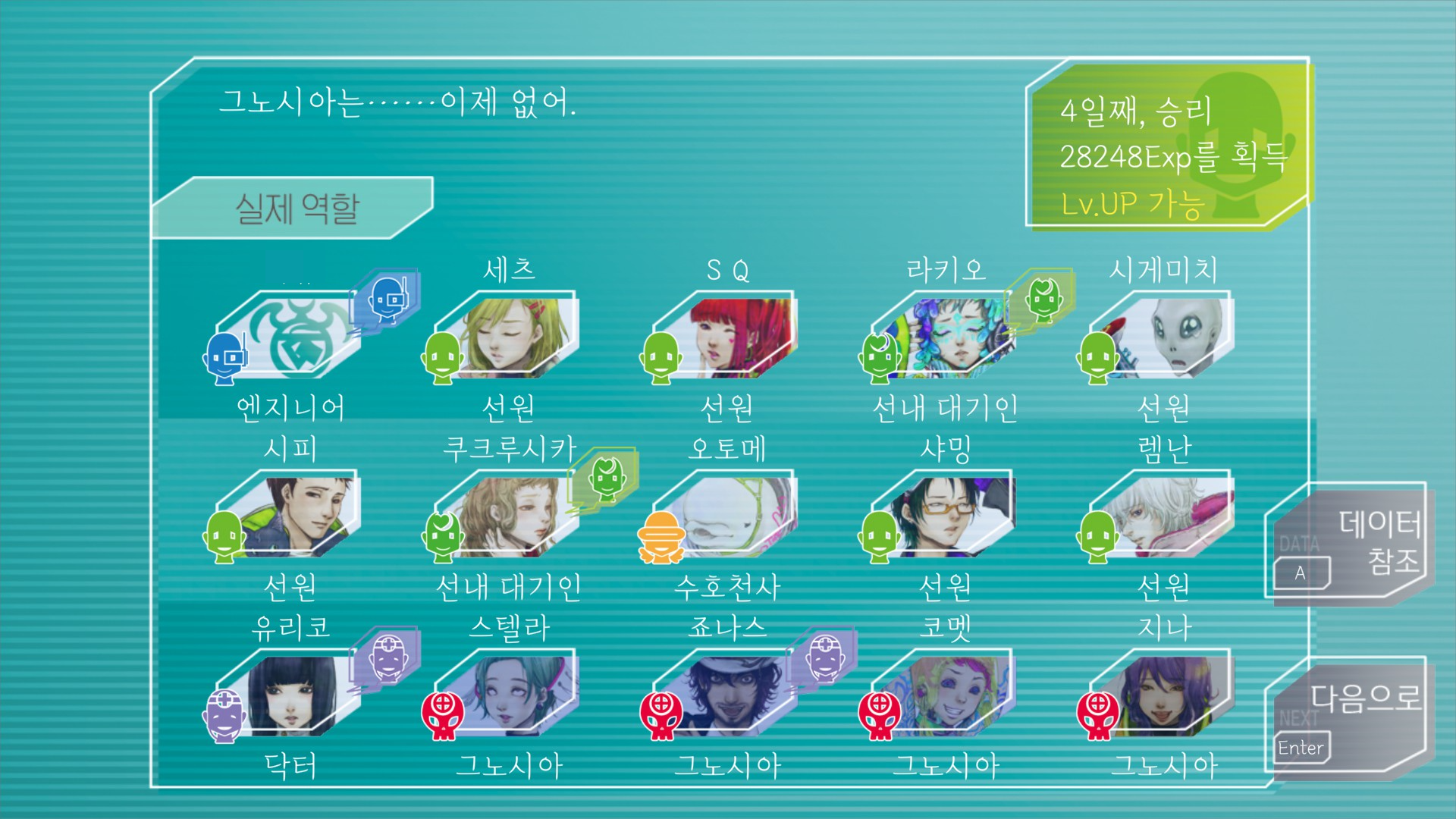문제를 해결하는 방식도 그동안 모은 정보들을 활용해서 해결해서 특기사항을 모으라고 했던 이유가 열쇠라는 설정과 수집요소였던 것만이 아니었다는 점이 벅차오름. 첫날 SQ가 그노시아였던 이유가 마난하고 이어질 줄도 몰랐음. 게다가 쿠크루시카 정체가 당연히 제일 반전이었다. 옮겨갈 몸으로 쿠크를 제시하는 세츠 보고 경악함ㅋㅋㅋㅋㅋㅋㅋㅋㅋ
