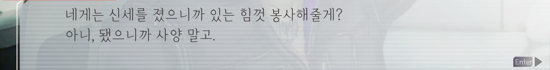 지나가 거짓말 싫어한다는 설정 풀린 후로 끝까지 지나 믿었던 회차 있었는데 내게 한 모든 말이 뻥이어서 충격 받은 적 있음. 대충 50루프까진 애들이 거짓말했다고 알려주거나 협력하자고 하면 다 믿었는데 세상의 권모술수와 비정함을 배우고 적당히 걸러듣기로 했다.