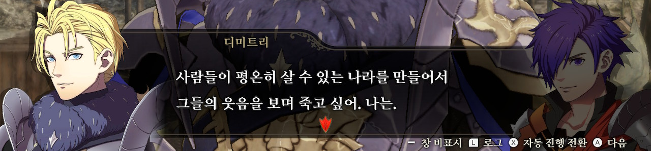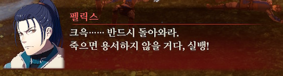 디미트리 손에 죽는 영광ㅠㅠㅠ이라고 쓰려다가 반대항전 난입 외전에서 검 들고 갔다가 디미트리한테 얻어맞고 사경을 헤맨 기억이 떠올랐다. 펠릭스 말 하나도 틀린게 없다. 디미트리는 멧돼지가 맞음. 적으로 만나기 싫은 남자 1위. 처음으로 입은 데미지 비율 300% 떴더라...