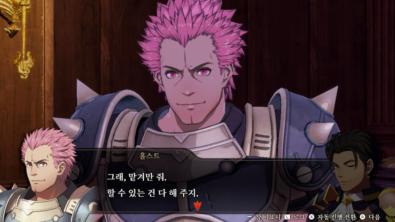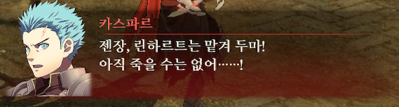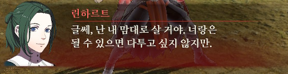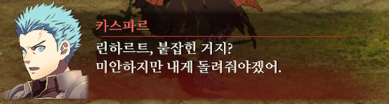 본편 적대 대사가 가장 좋았던 관계였다. 이들이 개쩌는 점은 린하르트는 다투고 싶지 않은거지 싸울 수도 있다고 상정하는 것과 적대했을 때 불같이 화낼 줄 알았던 카스파르가 의외로 평온했다는 점. 린하르트가 국가나 가문에 얽매이지 않는 사람이라는 걸 아니까 분노하지 않았다는게 나를 미치게 해. 근데 지금은 린하르트가 투항하니까 화내면서 찾으러 오잖아 대사도 저게 뭐임 돌려주래(☉∀☉) 퇴각할 때 린하르트 맡겨둔다는 것까지 최고다. 근데 카스파르 다음 등장 때 퇴각이었나 사망이었나. 그때 린하르트 데려가면 대사 나오나 궁금해짐.