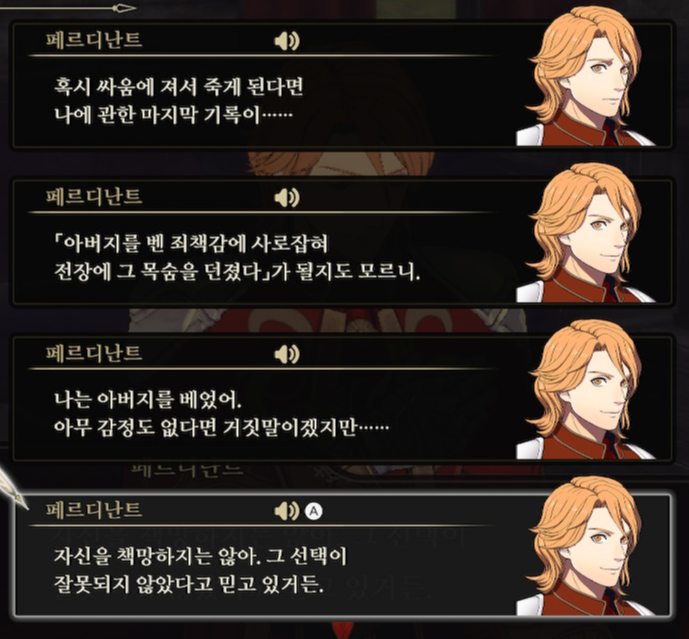 무쌍은 삼반장이 못 다 이룬 숙원을 처리하는 IF스토리라고 생각했는데 페르디난트한테 이런 장면이 쥐어져서 놀랐다. 본편 페르디난트는 어느 루트를 가도 아버지를 자기 손으로 단죄하겠다는 목적을 이루지 못했는데 그걸 무쌍에서 컷신까지 받으면서 달성할 줄은 몰랐지. 대사 몇 개랑 산책대화로 끝날 줄 알았는데ㅋㅋㅋ